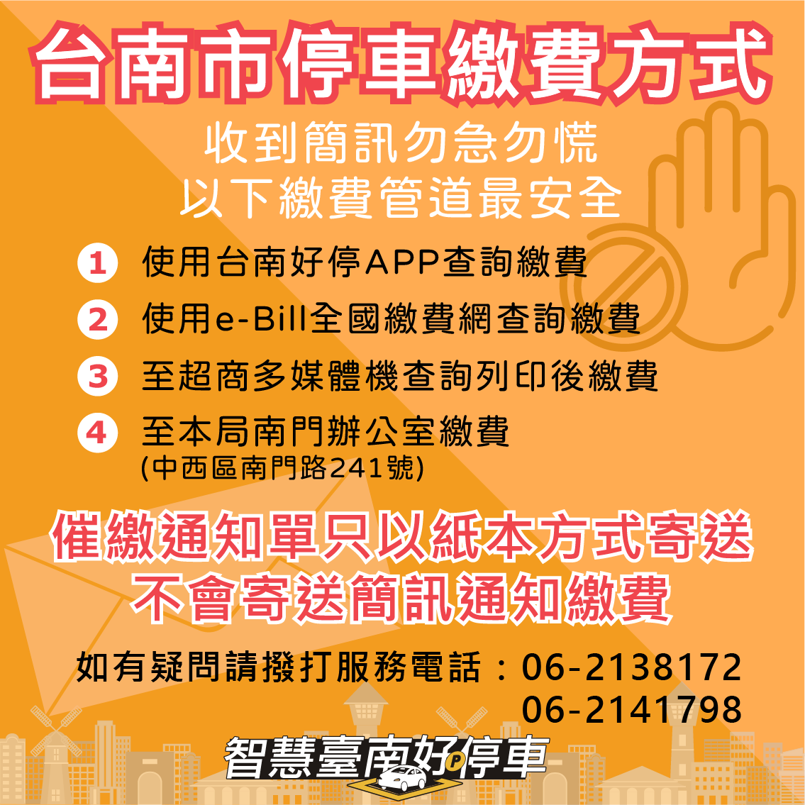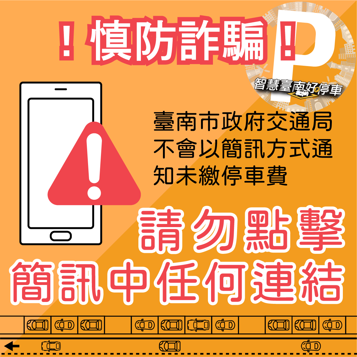 民眾如接獲相關簡訊,可撥打(06)2138172、2141798#0查證,停車費繳費需求可多利用「台南好停APP」線上繳費,同時APP亦有「即時停車地圖」可查詢路邊剩餘格位資訊,節省民眾尋找停車位的時間。