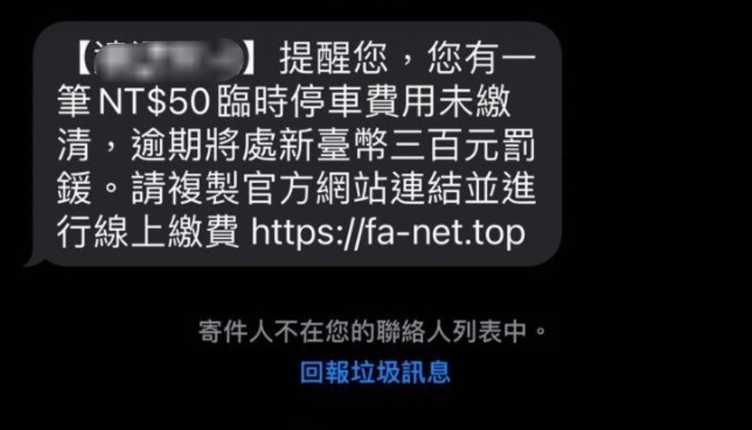 台南市政府交通局近期接獲民眾反應收到冒名發送停車費欠費簡訊,內容為:「提醒您,您有一筆NT$50停車費用未繳清,逾期將處新台幣300元罰鍰。請複製官方網站連結並進行線上繳費(釣魚網址)」,交通局提醒民眾注意只要收到簡訊開頭「沒顯示車號」且結尾「有繳費連結」,就是詐騙簡訊,請勿開啟或點擊網址連結,以防上當受騙。
