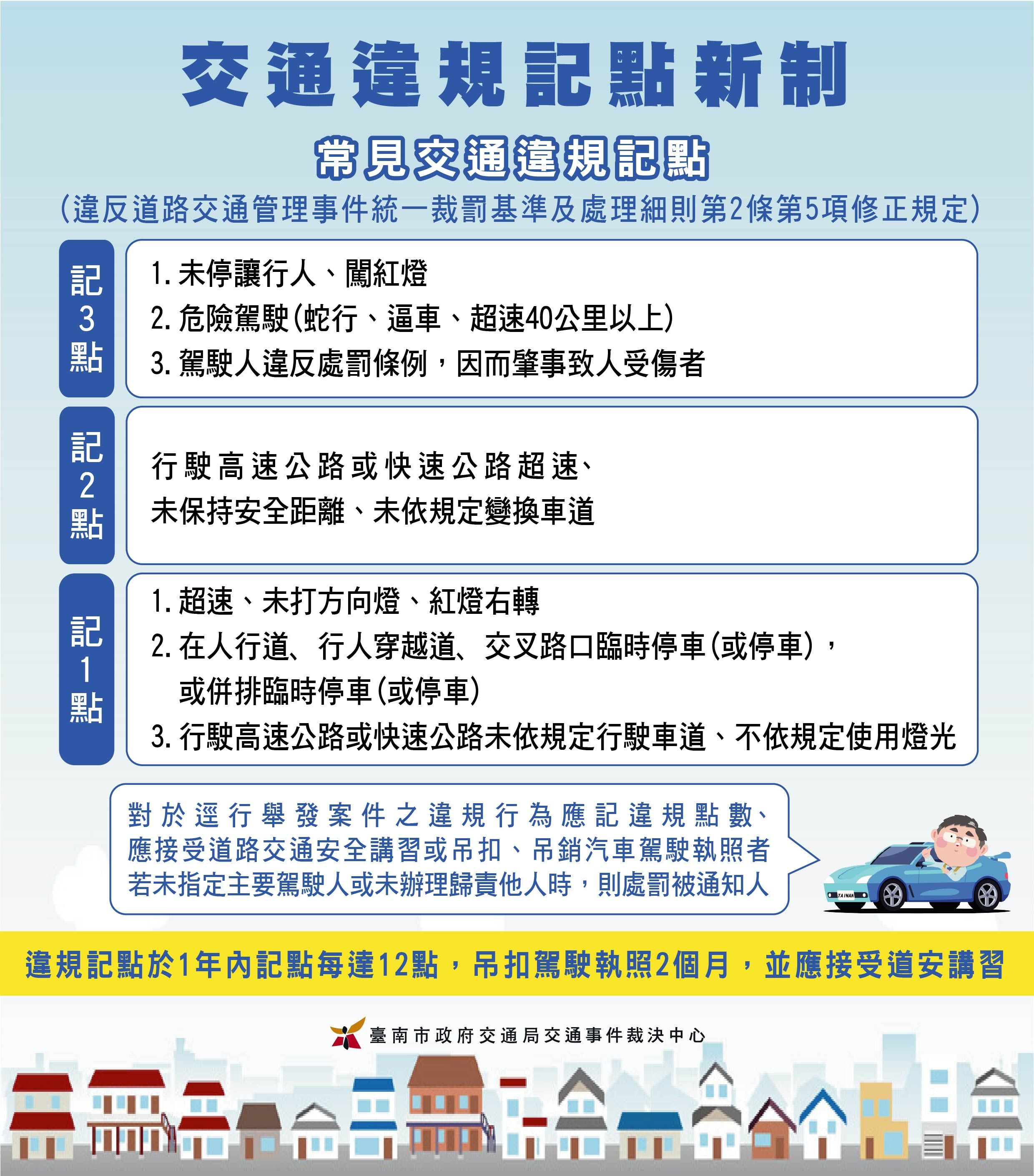 交通局局長王銘德表示,汽車駕駛人違反道路交通管理處罰條例規定者,除依規定處罰外,並得依對行車秩序及交通安全危害程度記違規點數1點至3點,違規記點於1年內記點每達12點,吊扣駕駛執照2個月,並應接受道安講習。