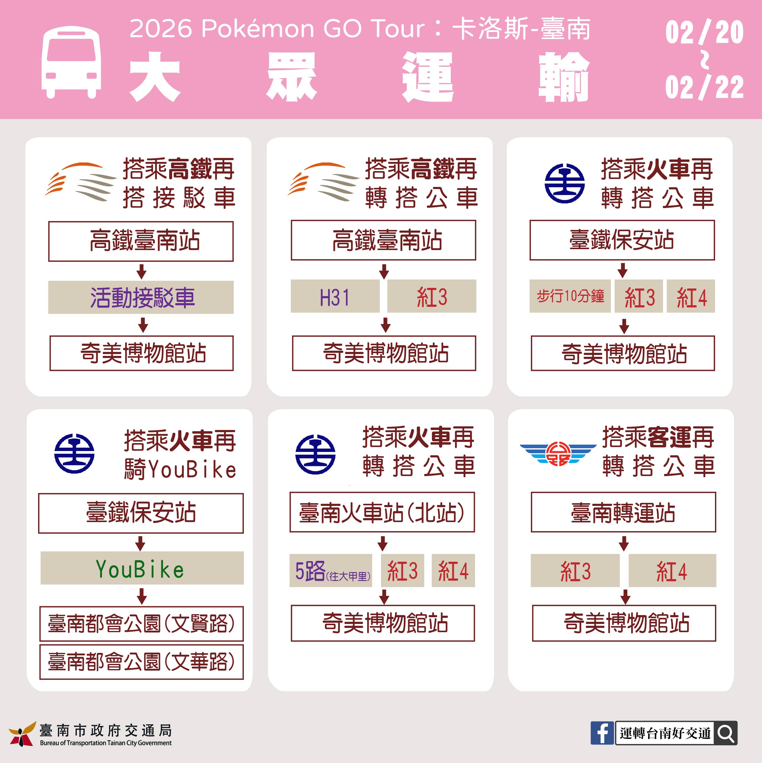 交通局說明,活動三日除原有的公車路線(高鐵快捷公車H31、紅3、紅4、5路(往大甲里))可抵達會場,本府觀光旅遊局將提供二條分別自高鐵臺南站及家樂福新仁店往返臺南都會公園活動主會場的免費接駁公車,讓搭高鐵來的外地遊客及開車民眾便利停車轉乘。此外,鼓勵大家多利用臺鐵班次前往保安站下車,免去開車找車位的困擾,不論自高鐵臺南站搭乘沙崙線,或南下或北上區間列車,均可選擇於臺鐵保安站下車後步行約10分鐘前往臺南都會公園(奇美博物館),臺鐵公司也提醒搭車民眾保安站的站體空間有限,請提前購票或利用電子票證進、出站,以加快通行速度。相關資訊可至本府網頁及《Pokémon GO》活動官網查詢https://pokemongo.com/zh_Hant/gotour/tainan、台南旅遊網 https://www.twtainan.net/zh-tw/、台南旅遊臉書粉絲團 https://www.facebook.com/traveltainan。
