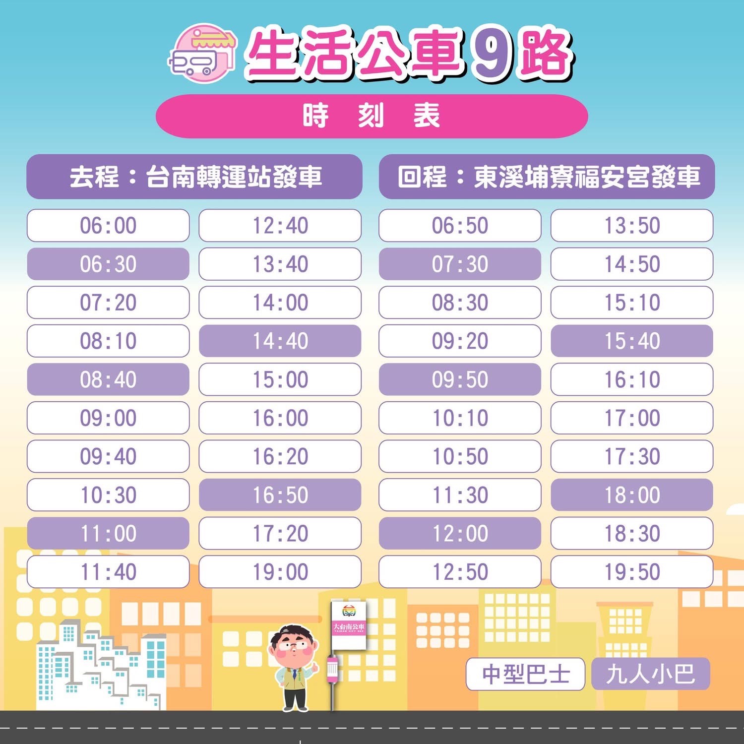 台南市公共運輸處長吳俁之表示,9路公車路由台南轉運站往返東溪埔寮福安宮,途中行經台南火車站、台南二中、大光國小、延平市場(長榮路)、瀛海中學、怡安路口、長安國小、新寮、公親里活動中心、新吉工業區、新復里、北極殿等重要據點。相關資訊可於大台南公車網站http://2384.tainan.gov.tw ,亦可電洽台南市公共運輸處:(06)223-0330、統聯客運:0800-676-676,或撥公車語音查詢電話:(06)299-8484(我坐坐巴士巴士)