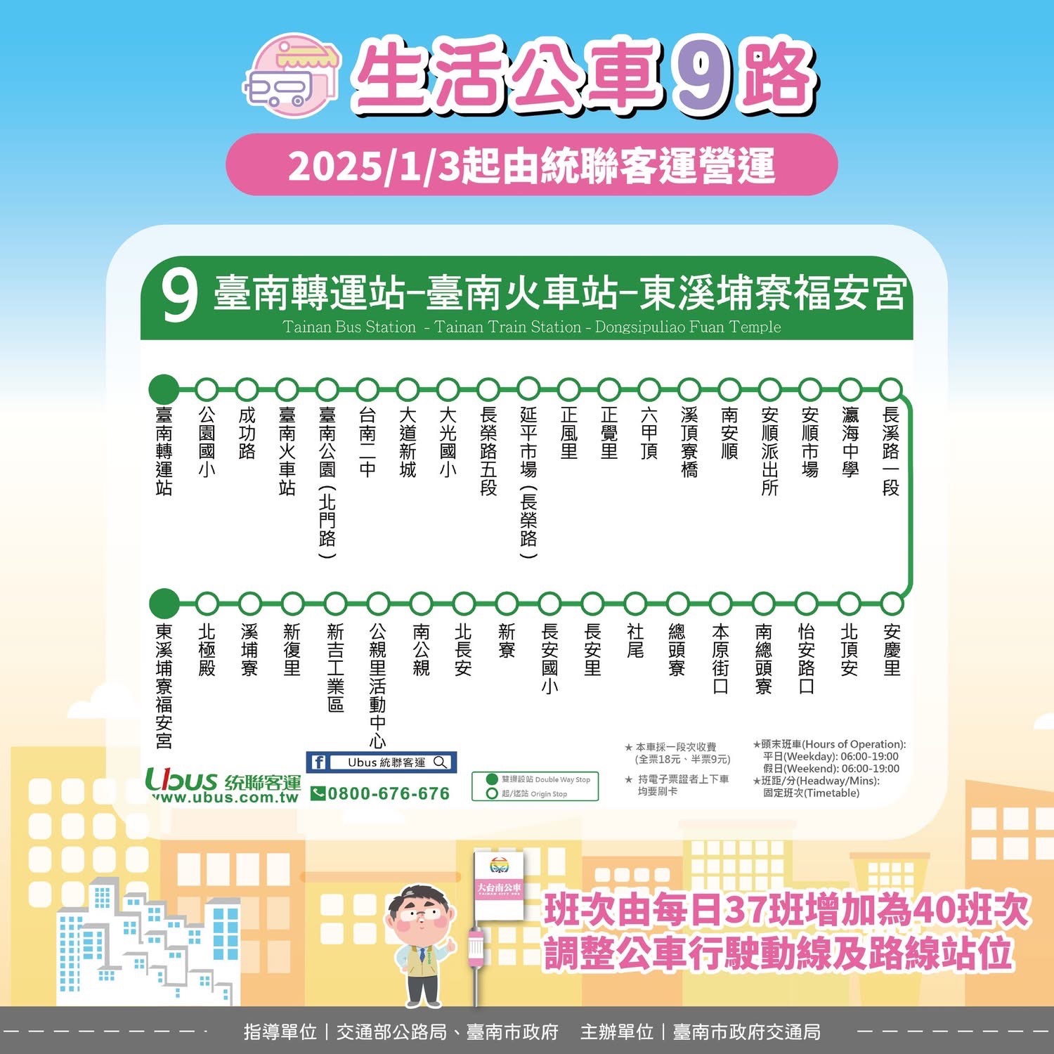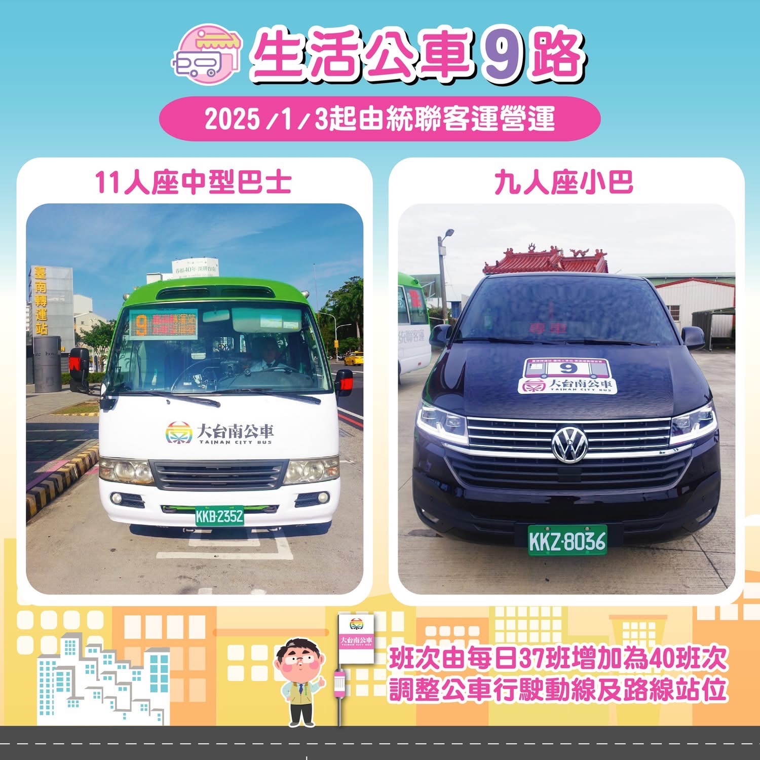 台南市區公車再有新業者上路營運!統聯客運於114年1月3日起接手營運「9路」生活公車,同時由每日37班次增加為40班次,並依路況、時段需求靈活採用中型巴士及9人小巴混合調度,歡迎市民朋友多加利用。