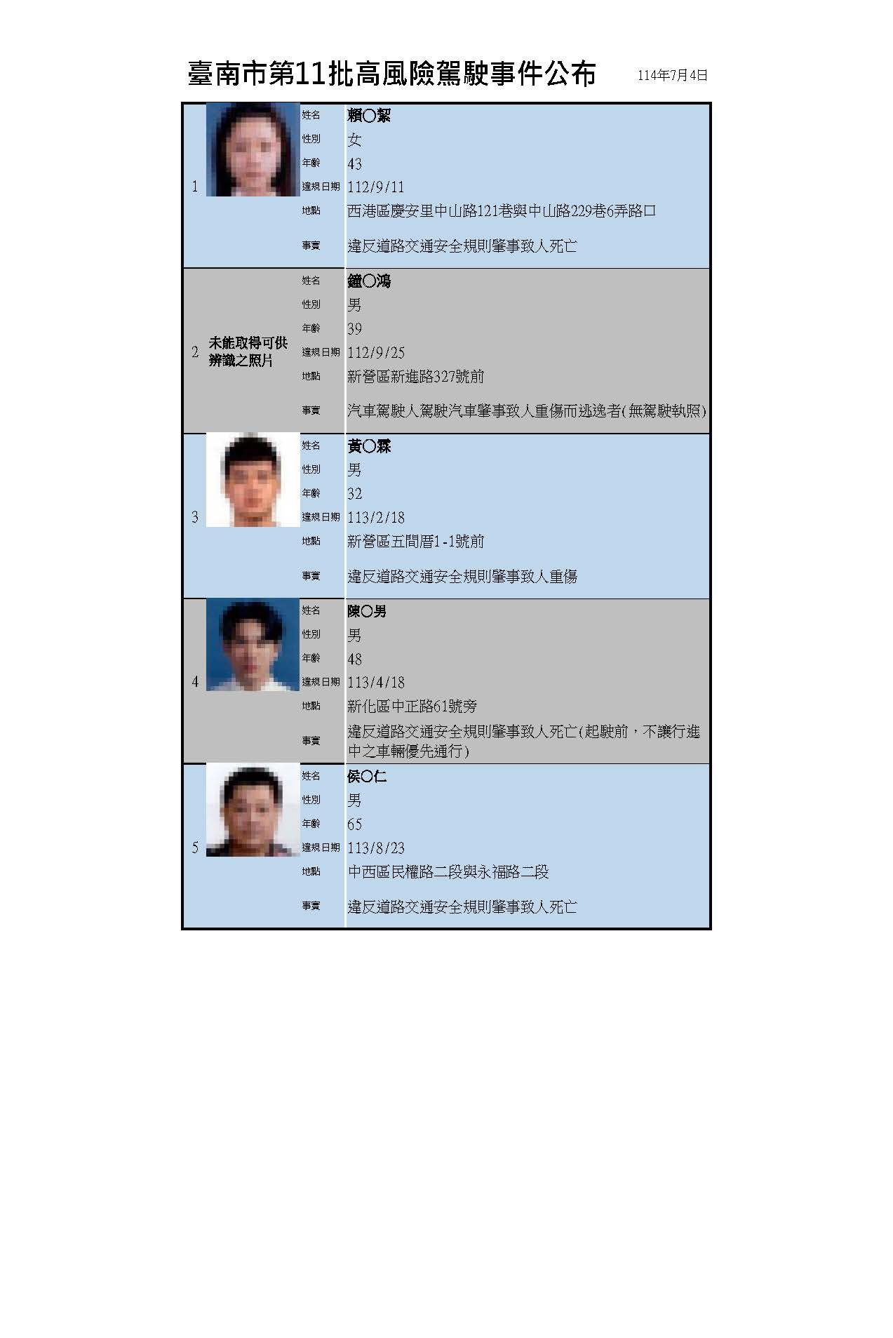 交通局表示,台南市高風險駕駛事件資訊公開作業原則於112年8月11日公告施行,公告對象係就汽車駕駛人違反道路交通管理處罰條例因而肇事致人重傷或死亡者,或有其他受社會矚目的交通違規事件;於裁決處分完成後,依照公開作業原則將相關資訊去識別化,公布在交通局網站「高風險駕駛事件公布專區」。