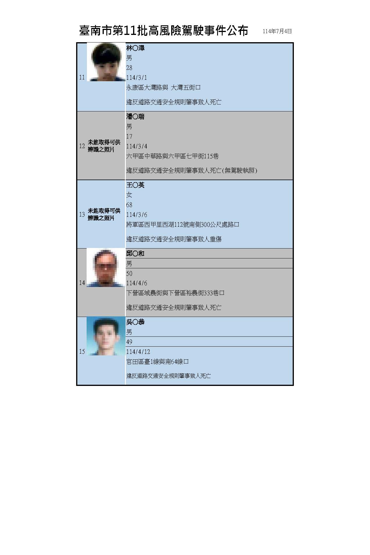 交通局指出,此次第11批高風險駕駛事件計15案,違規地點分別在新營區4件、六甲區3件、將軍區2件、中西區、永康區、新化區、官田區、西港區、下營區等地,駕駛人因違反道路交通安全規則肇事致人死亡,駕駛執照經吊銷後3年內不得重新考領。