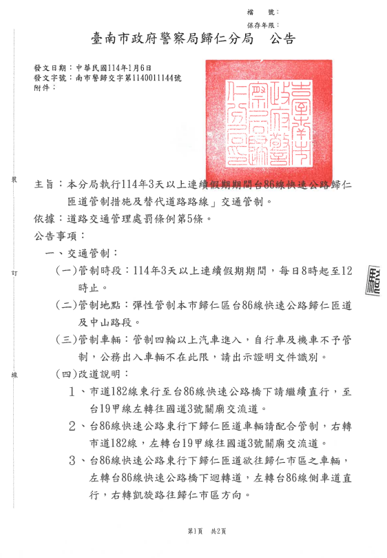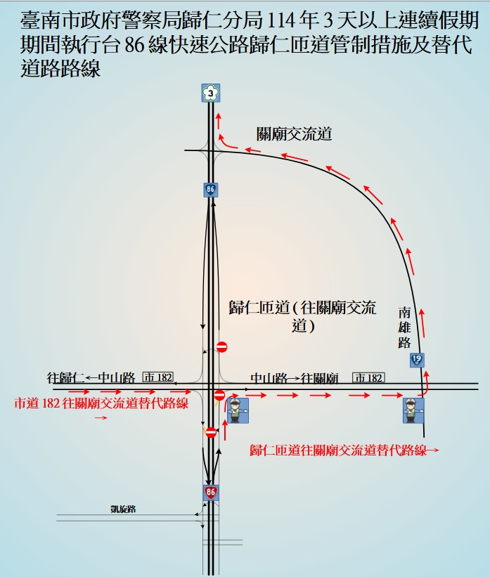 說明:一、依據道路交通管理處罰條例第5條辦理。二、本分局於114年3天以上連續假期期間,為有效疏導台86線快速公路東行往國道3號關廟交流道車流,故實施旨揭交通管制措施。三、若實施交通管制,請用路人配合提前改道,並遵從交通疏導人員指揮及注意行車安全。