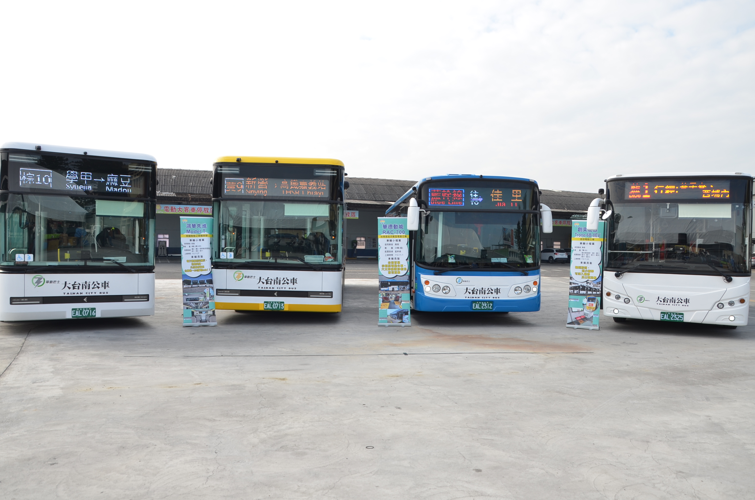 局長王銘德指出,本批電動公車共包括兩間客運業者及三種車型。其中興南客運20輛華德動能科技公司打造的示範型電動公車,是經過中央車型性能、路線營運、充電設備等項目嚴格審查的車款,車身依循台南市獨創的大台南公車六大幹線識別系統,全面採用藍色窗花意象塗裝,並且配備全彩LED車頭顯示,增進辨識度及鮮明形象;另外7輛創奕能源公司打造的「迷你電動公車」,因考量車輛行駛路線特性,特別選用軸距較短的低地板車型,較一般大型巴士更為短小精悍,可深入偏鄉及山區提供服務;車內仍配備1席無障礙席位,可說是「麻雀雖小,五臟俱全」。