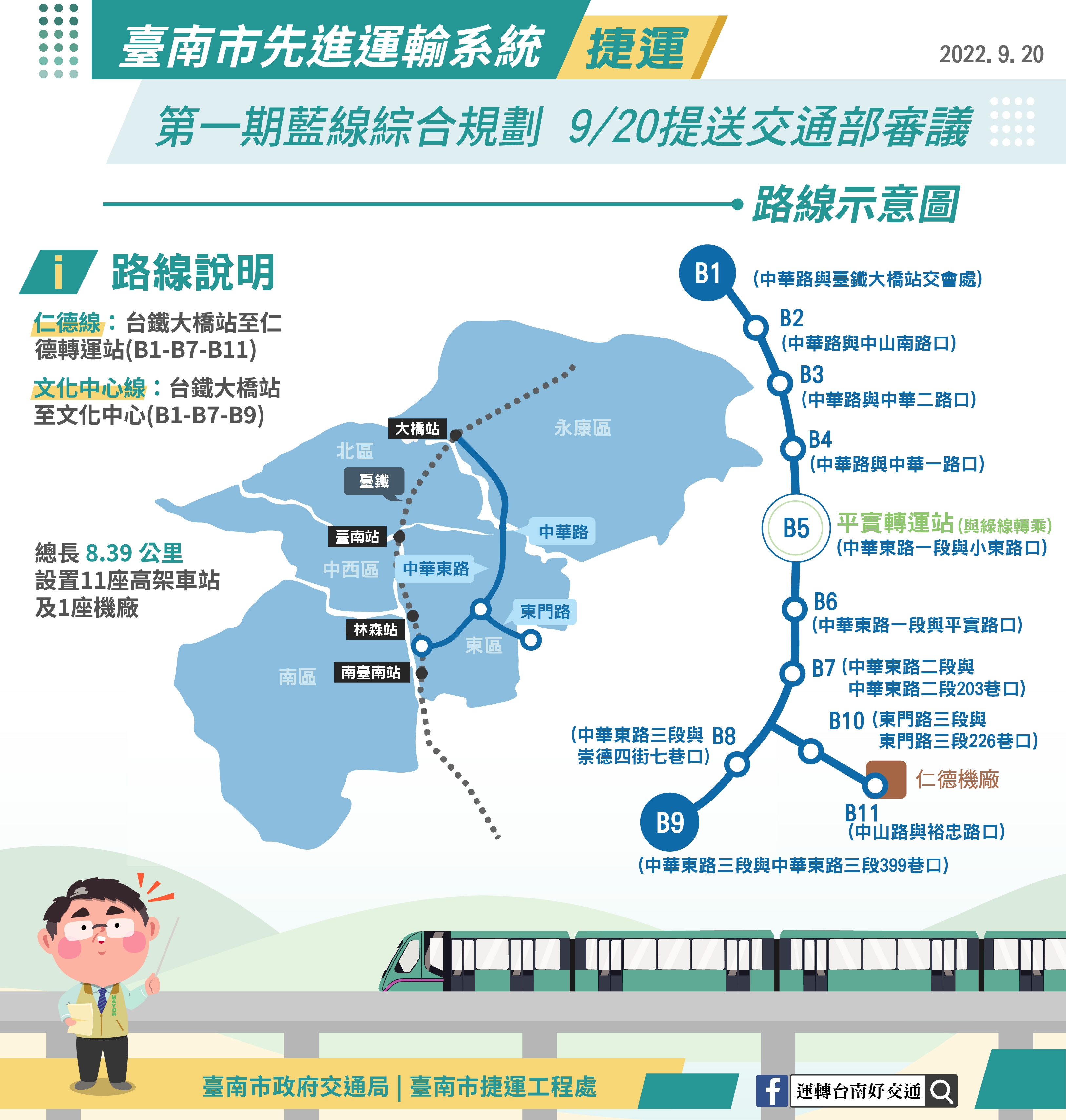 交通局局長王銘德表示,第一期藍線路線規劃自台鐵大橋站沿永康區中華路、東區中華東路至文化中心,並由中華東路與東門路口往東至仁德區中山路仁德轉運站,路線長度約8.39公里,全線共計設置11座高架車站及1座維修機廠,並針對都市發展脈絡、道路交通以及對景觀環境衝擊較小等特性採高架單軌系統,初期規劃採仁德線(B01-B07-B11)與文化中心線(B01-B07-B09)兩種運行模式,未來仍會配合優先路網建構完成後,依實際運輸需求調整營運計畫。